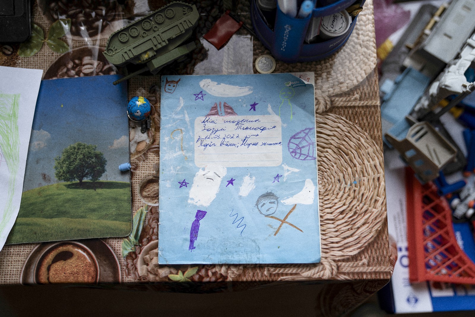 “Yesterday in the morning there was an air raid alert. You could hear in our village how planes were dropping bombs,” Tymophiy wrote in a journal entry dated March 3. The family — he; Seraphim; his mother, Yulia Vashchenko, 37; and his stepfather, Serhii Yesypenko, 43, known as Serozha, hid in the cellar.