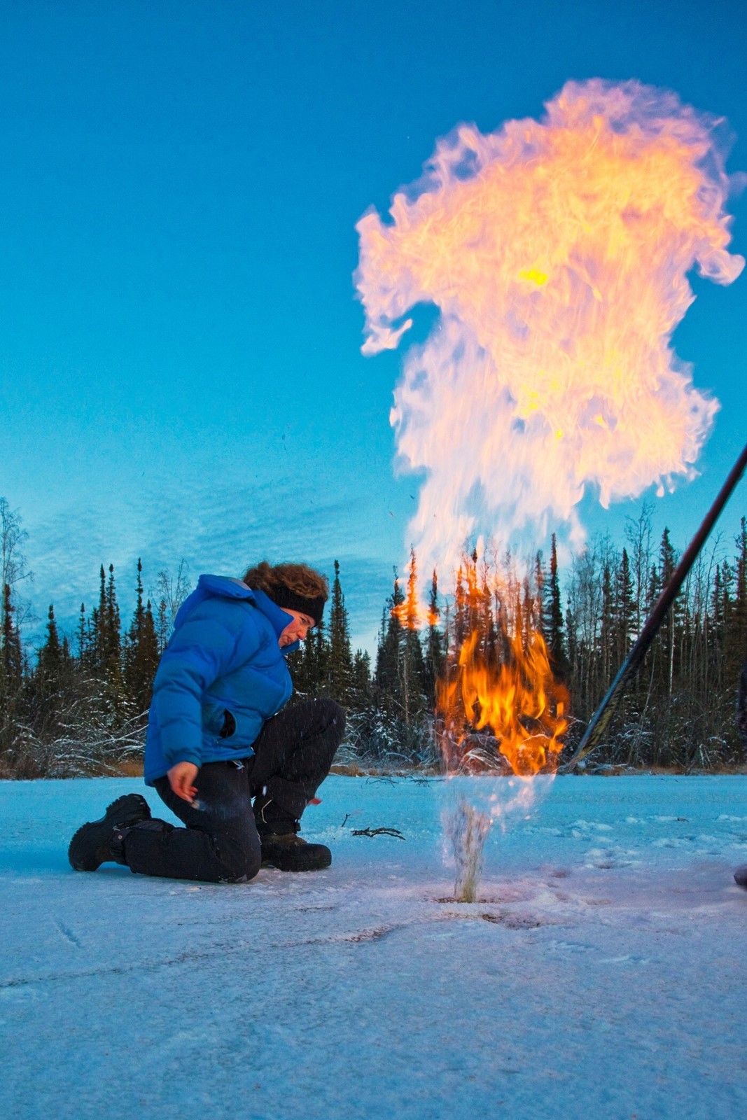 “Yes!” both boys shout at once. Jorgen grabs the long ice spear from the sled and plunges it into the ice-sealed gas pocket. I light a match, and instantly a bright orange ball of fire soars above our heads. Our faces and hands are warmed by the lingering flame leaping from the lake ice as methane burns into less potent gases, carbon dioxide and water vapor.