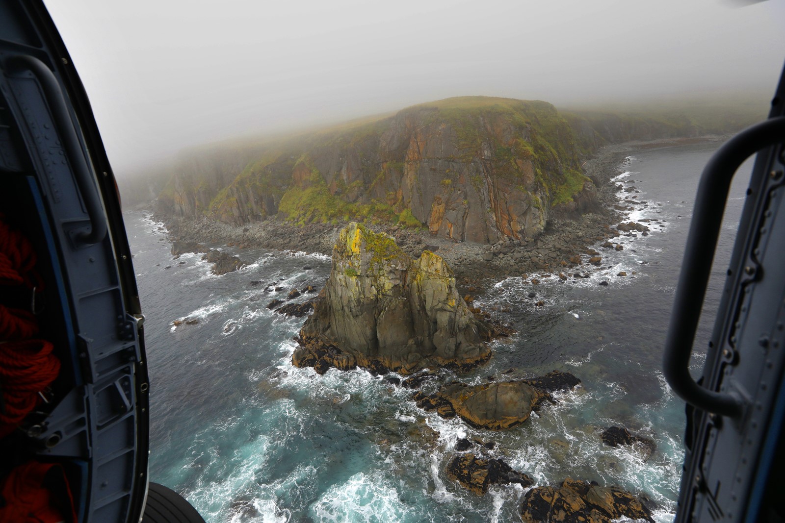 The pilots circled and deftly landed on a little strip of sand, careful to keep the rotor blades from hitting the eroding wall of rock on the beach’s edge.