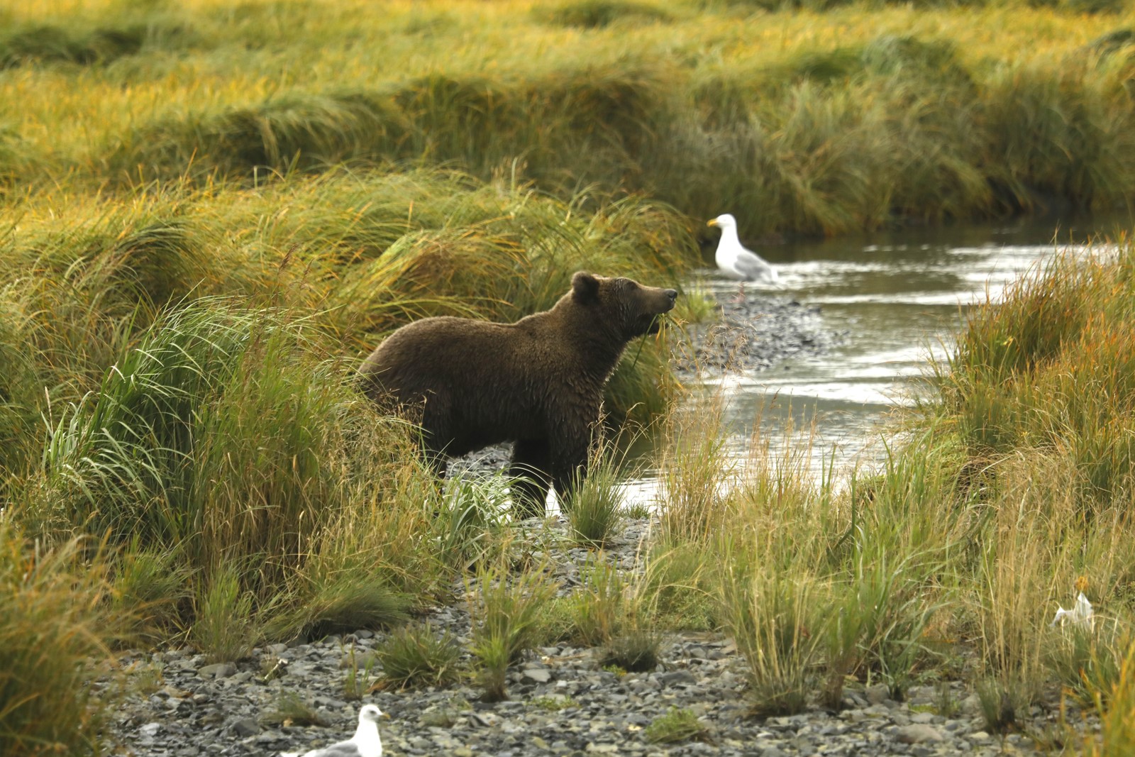 The clouds hung low, so the copter hugged close to the sandstone cliffs that rise from this green island, which gets about 80 inches of rain and 60 inches of snowfall every year. Although few dead animals were spotted on this September afternoon, plenty of furry brown Kodiak bears could be seen bounding across open fields and along the beaches, trying to escape the ruckus of the approaching chopper.