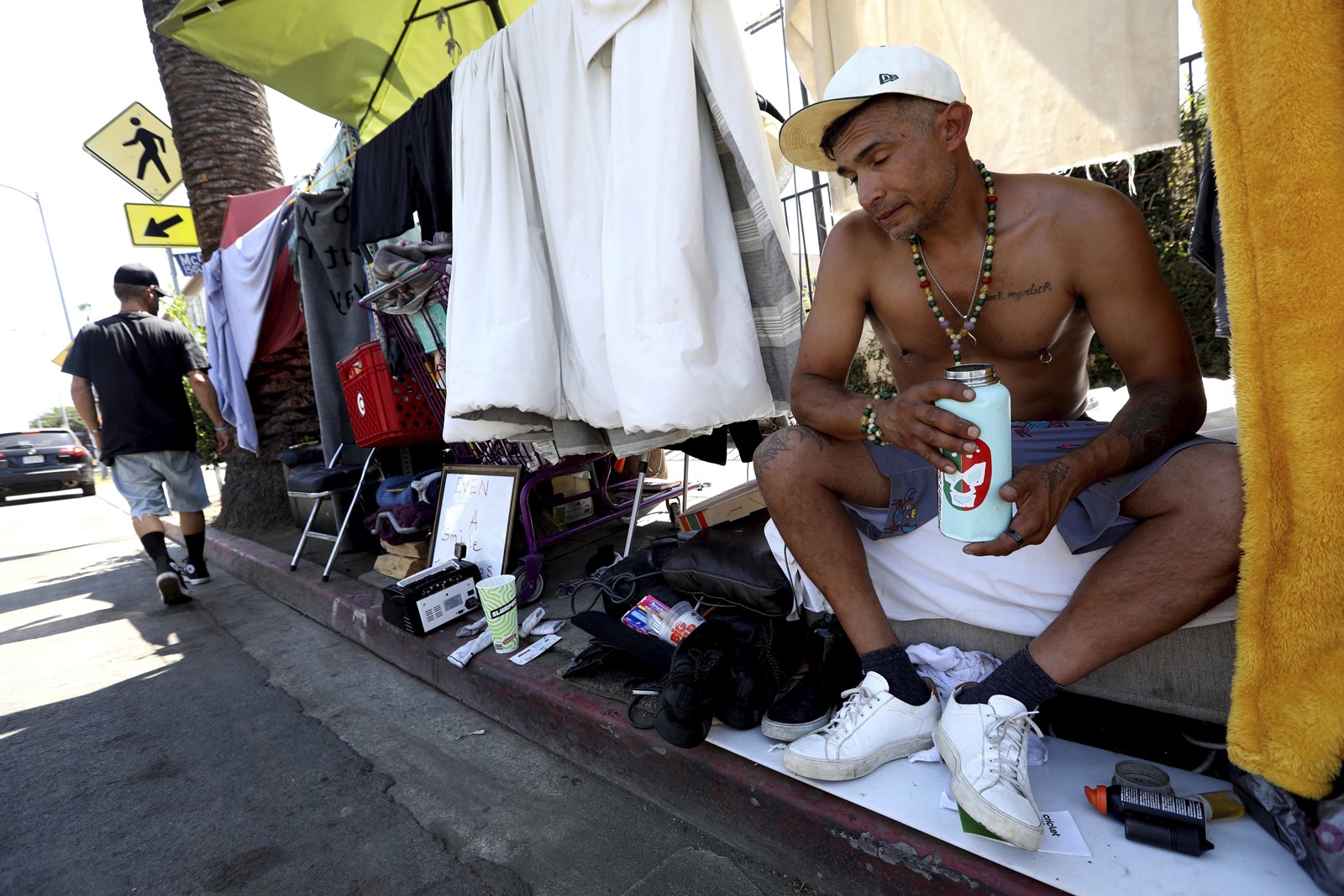 “It’s hot out here,” she said with stoic understatement, reclining next to two jugs of bottled water near a freeway overpass and a busy street in Sacramento. “I get through it with God.”