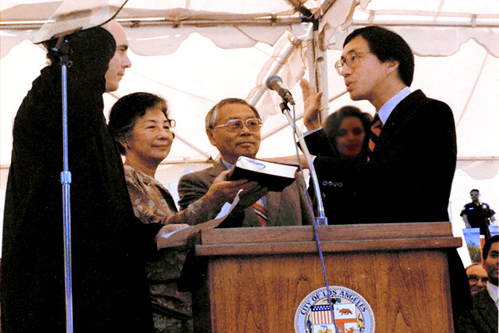 And in the 1980s, Dad, a loyal Republican, set aside his political differences with my brother, Mike, to support his run for Los Angeles City Council. Mike became the first Asian American to win a seat on that body, a victory over the prejudice that Dad had spent much of his life trying to erase by reaching out to people who were different from him and showing them they had nothing to fear and much to gain through friendship.