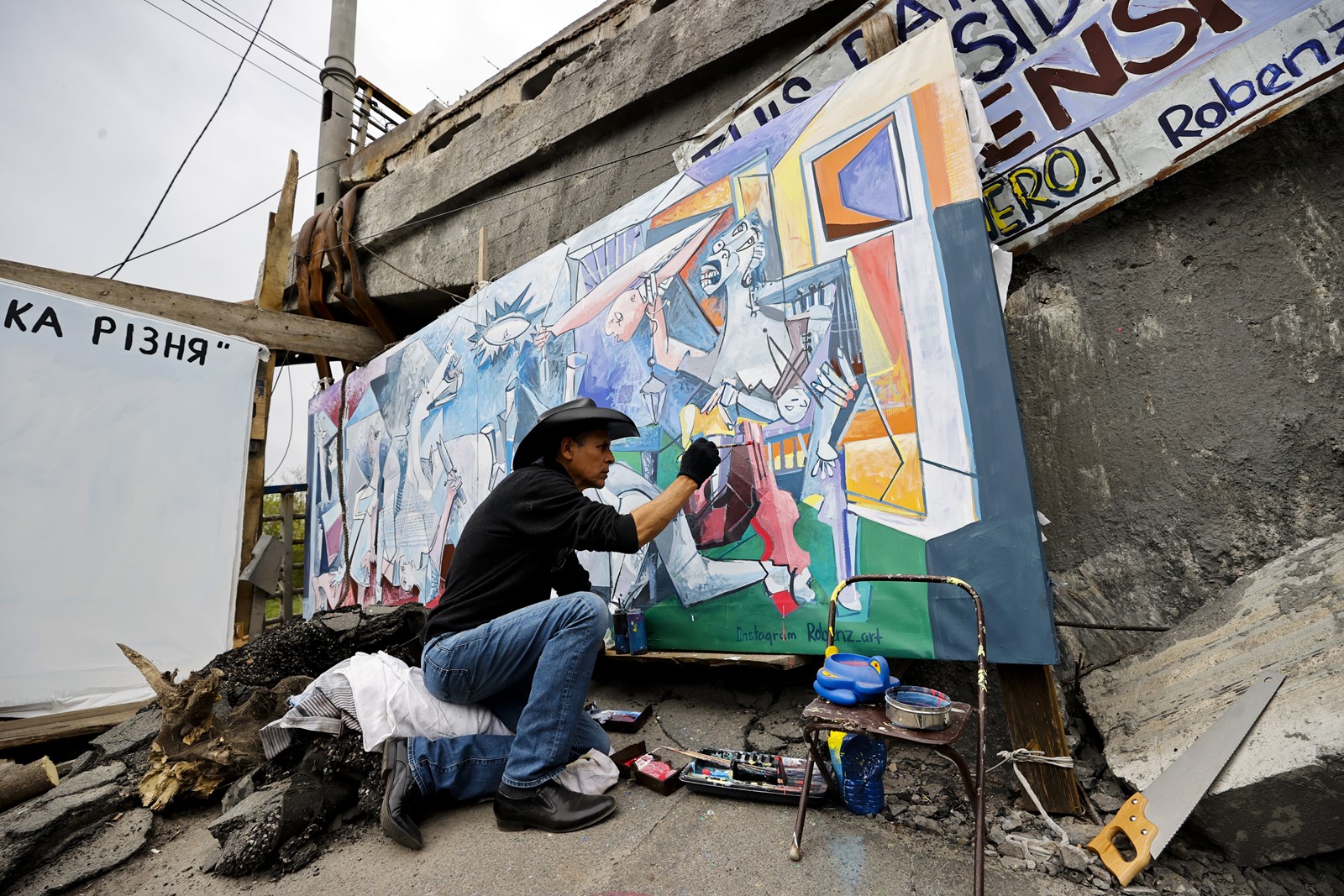 And so Marquez — an artist who views his work as social advocacy — made his way to Poland and then to Kyiv. Once the Russians retreated from their positions around the city in late March, he set up a makeshift, open-air studio in the shadow of the shattered bridge.
