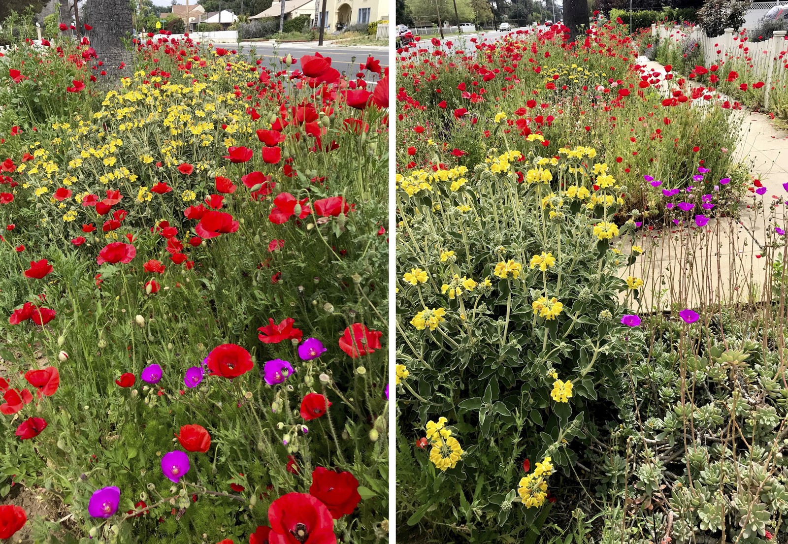 A California garden grows in a unlikely place, where native poppies nod into the bike lane, brushed back by roaring Harleys and pickups