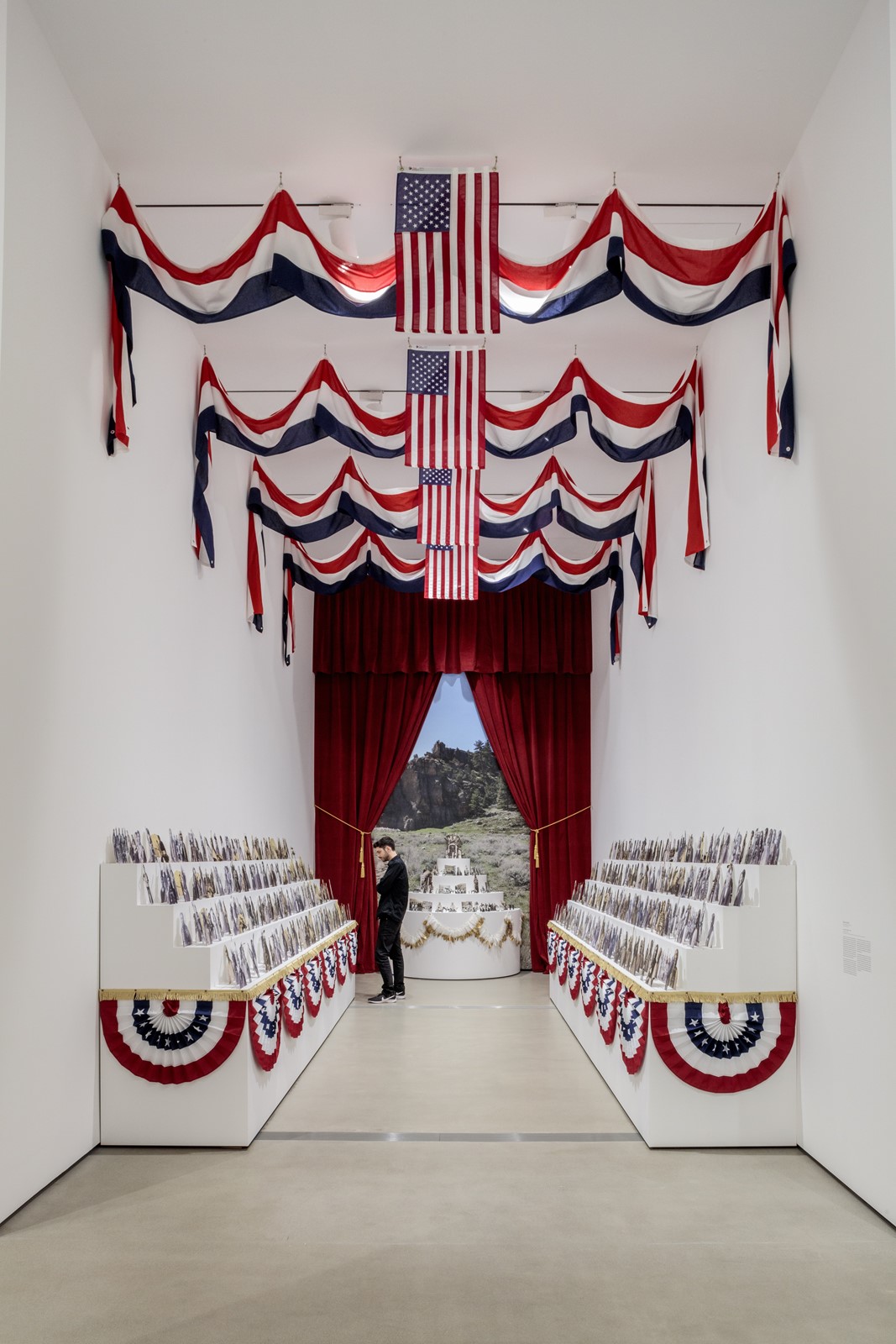 She has taken his portraits and cut away their formal backdrops, presenting the congress’ participants as silhouettes on a set of stepped shelves. It’s a design she borrowed from the expo itself: specifically, the stepped displays employed by agricultural concerns to show off regional fruits. At the far end of the display, she has included a separate set of images that Rinehart took around Red Star’s hometown of Pryor, Mont., as well as a color image of an Apsáalooke sacred site known as Baahpuuo. The entire installation is trimmed with red, white and blue bunting. (It is part of a group show at the Broad, curated by Sarah Loyer, that explores the ways in which artists have used the symbolism of the U.S. flag in their work.)