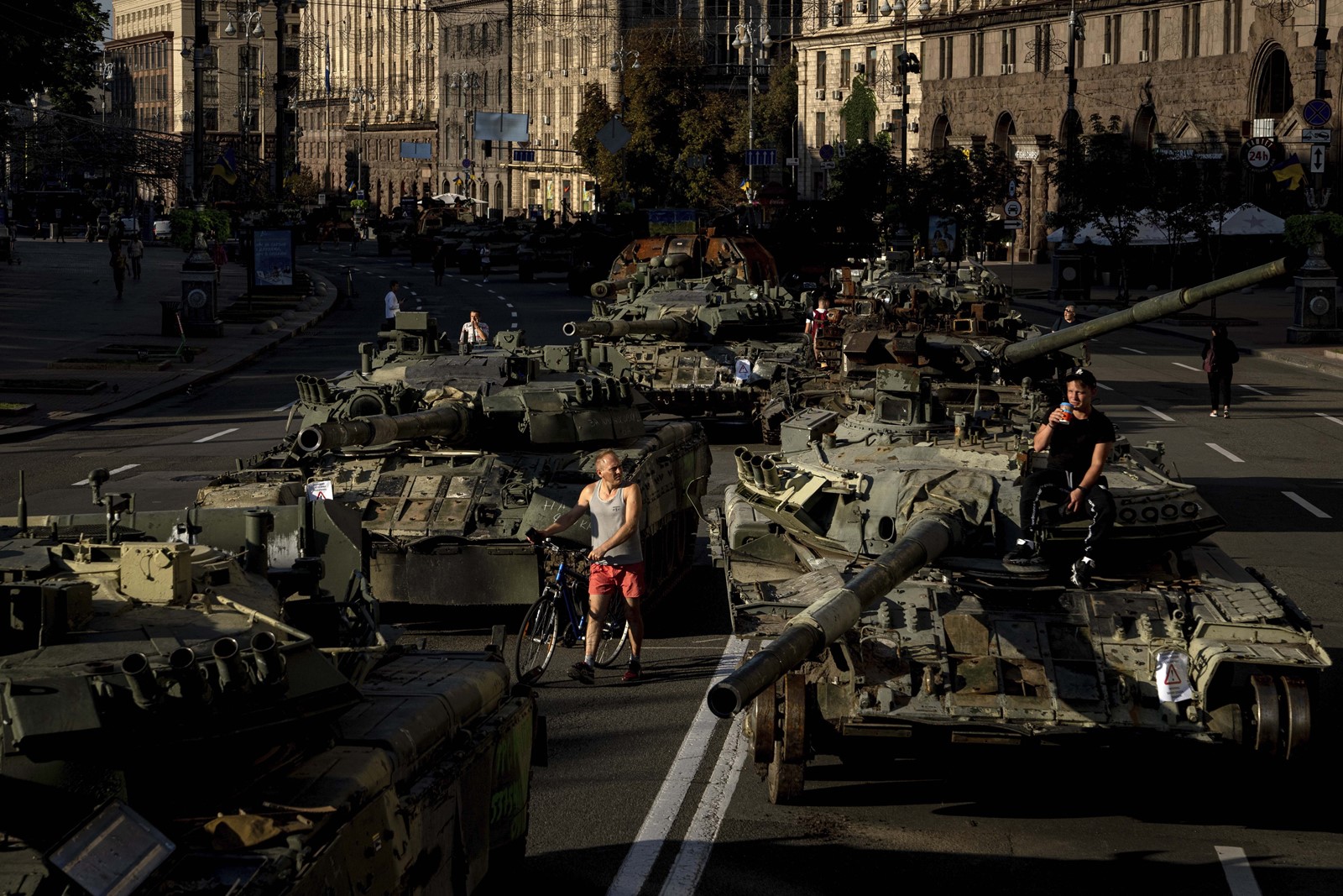 Nevertheless, a festive atmosphere prevailed during the day at Kyiv’s Independence Square, known as Maidan, as thousands of residents posed for pictures next to burned-out Russian tanks put on display. Folk singers set up, and many revelers — ignoring the sirens — were out and about in traditionally embroidered dresses and shirts.