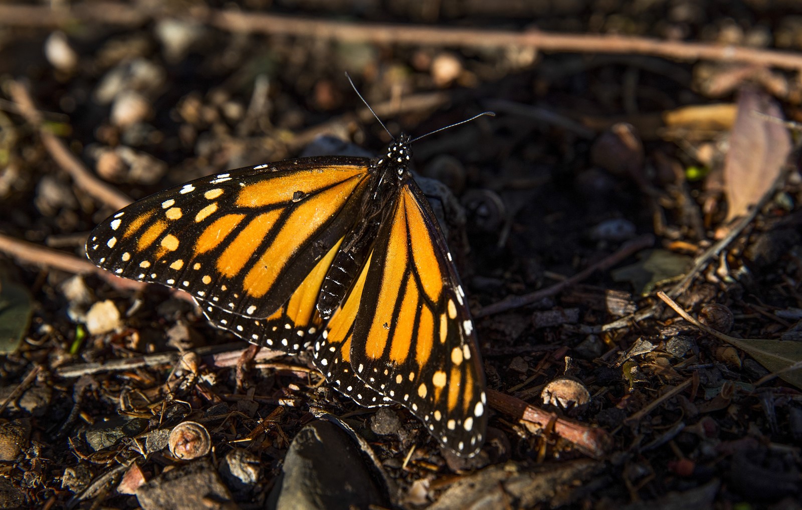 This morning, as his companions gape at the fluttering clusters on the branches, he begins scouring the ground under the trees. He finds several motionless bodies almost entirely camouflaged against the soil and gently pokes one, figuring it’s dead. Instead, the butterfly opens it wings and unsteadily takes flight, landing a few feet away in full sun, flexing its wings as though trying to limber them up.