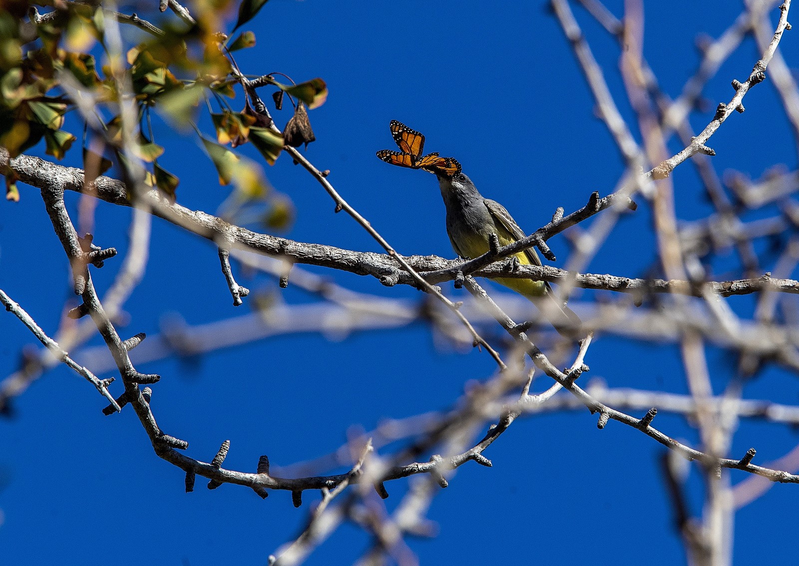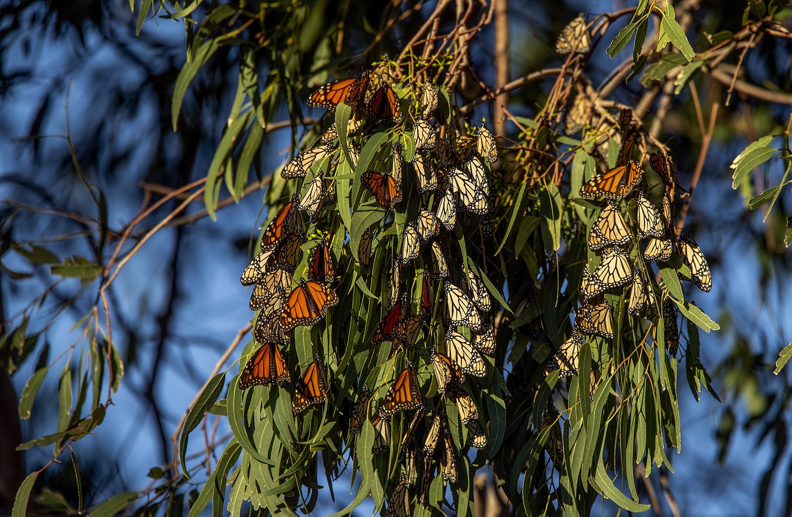 That situation changes at the next stop in Venice, at the Penmar Golf Course. There we find about 250 monarchs clumped together on high pine branches near the entrance. As golfers practice their putts, Rachman spots a trio of Cassin’s kingbirds perched at the top of a tall sycamore tree. It’s almost 8:30 a.m. now, and the monarchs are beginning to fly in the warming air. He watches as the kingbirds suddenly dart from their perch, snatch a butterfly from the sky and return to the treetop to gobble it down.