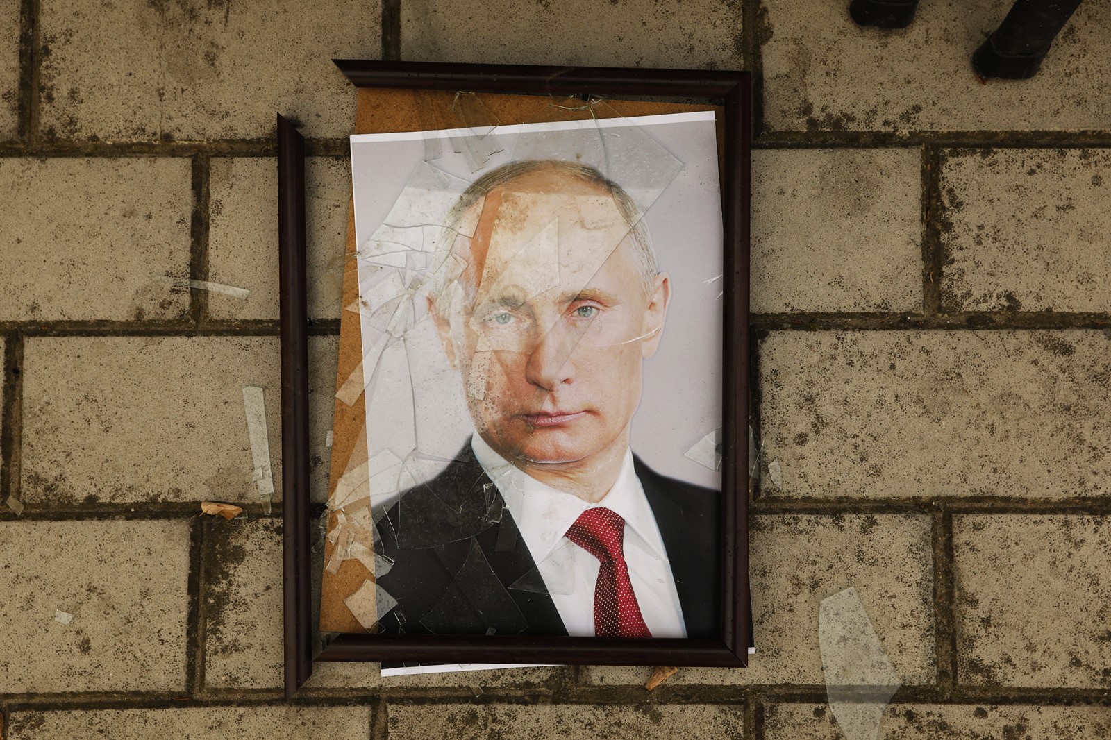 In the detention center’s courtyard, a framed portrait of Putin lay face-up with the glass shattered. Passing Ukrainians paused to stomp on it, and one leaned forward to dribble spit.