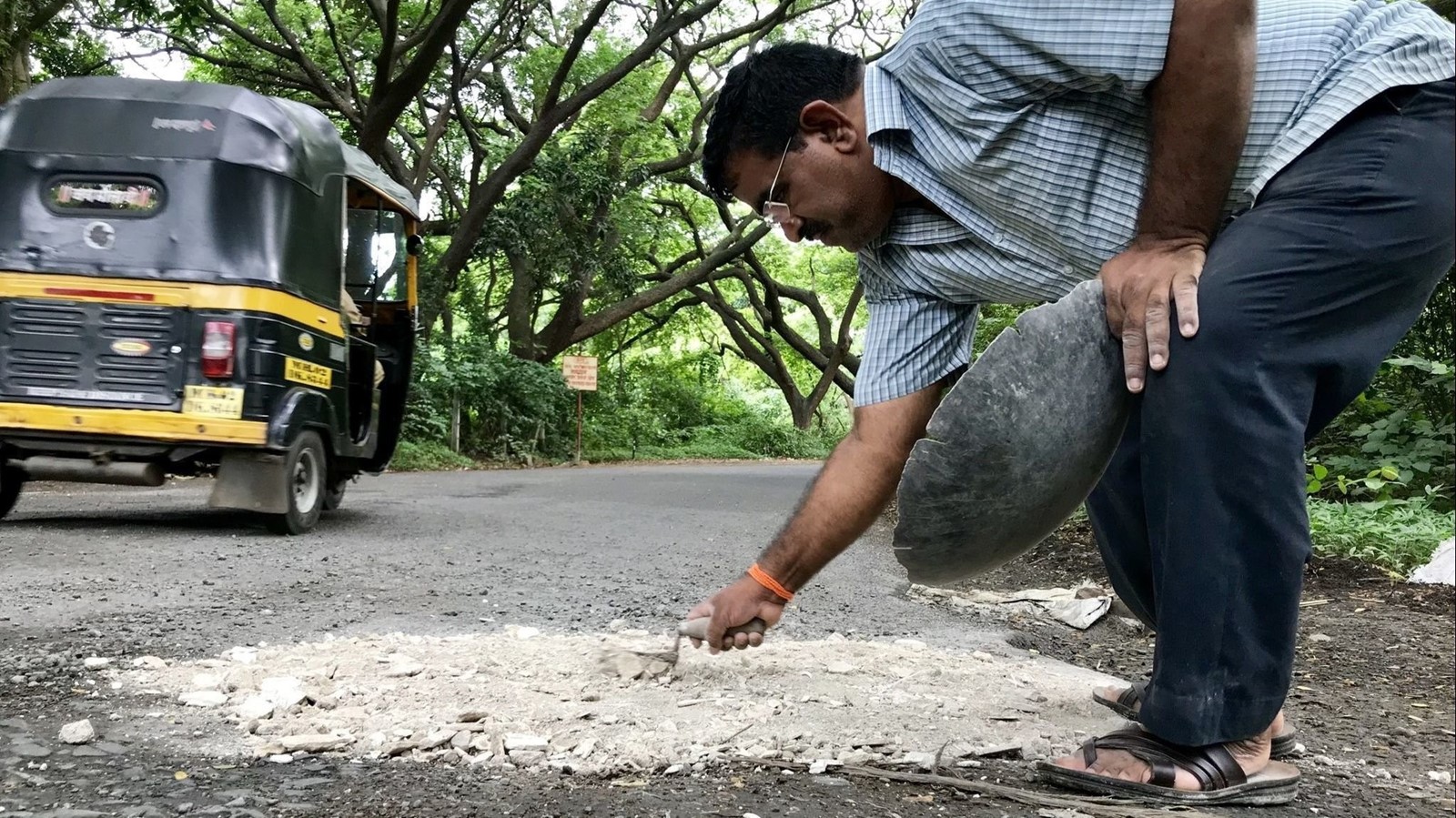 He scours construction sites near his home in Mumbai’s northern suburbs for debris that can be used to fill holes. He sends updates on his activities to a WhatsApp messaging group — named “Pothole Killers” — with nearly 100 members.