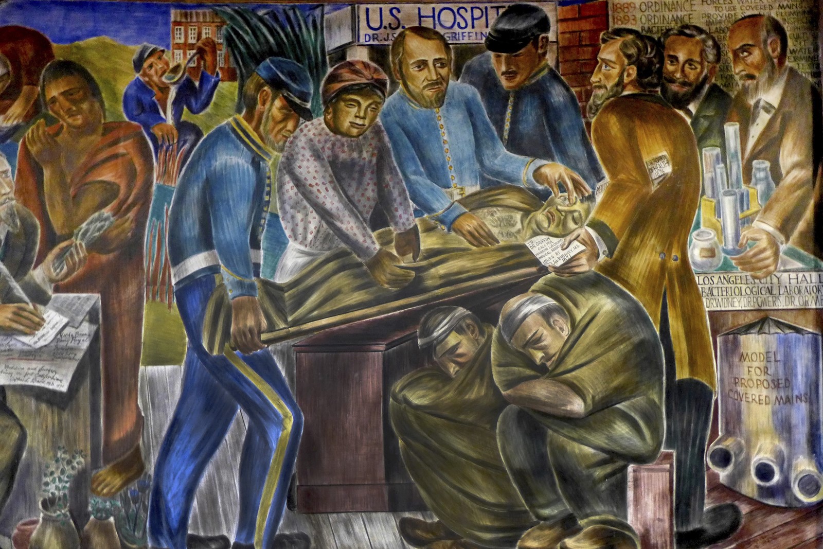 What makes the mural unique is its composition. Mason occupies center stage. She’s surrounded by a group of white men — soldiers, patients, doctors, city officials — but she’s not subordinate to them. Rather, she tends to the patient directly as a medical authority in her own right. Zakheim depicts Mason as she was: a healing presence and a pillar of early Los Angeles.