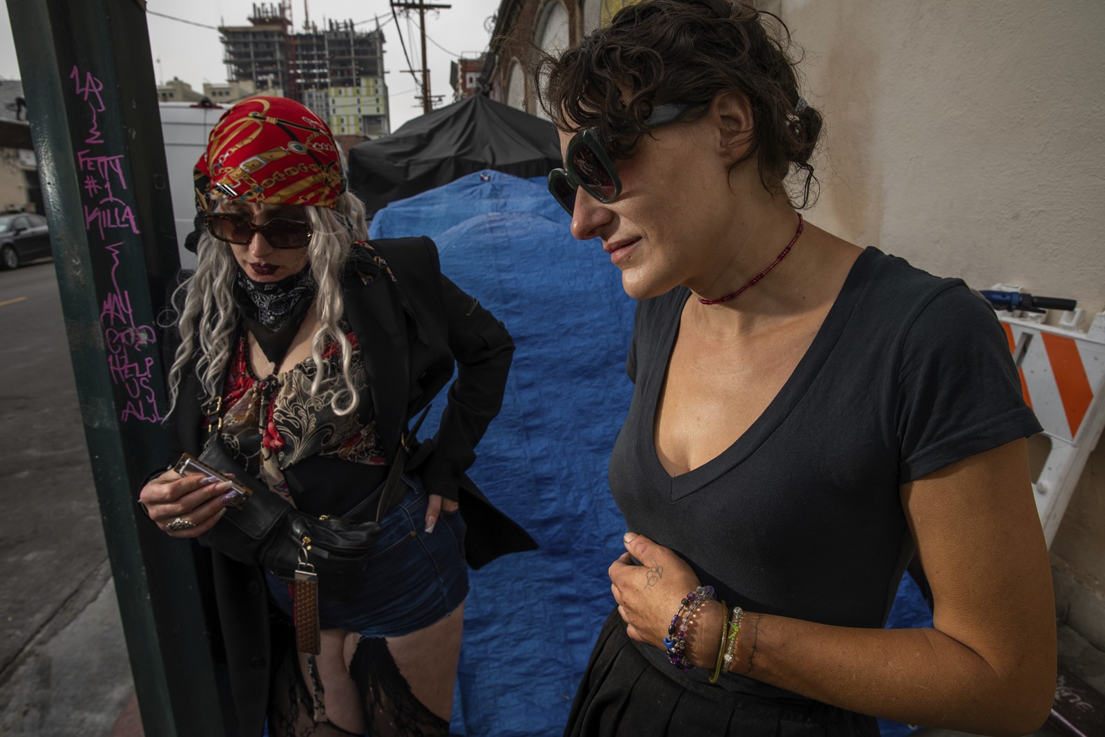 Next to a row of tents covered with blue tarps on Skid Row, Jasmine Paredes watched a friend scribble a message on a lamppost with a pink Sharpie: