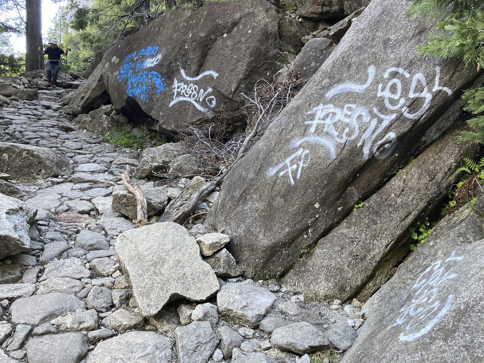Park rangers received multiple reports of vandalism on the popular Yosemite Falls Trail on May 20 around 8:15 p.m. When rangers visited the trail the next day, they found about 30 sites that were spray-painted with white and blue graffiti.