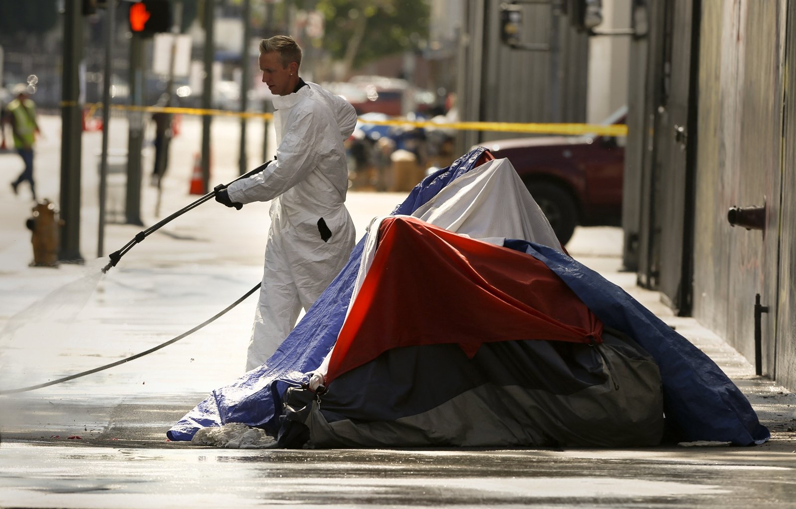 On skid row, officers switched from yellow to red crime tape to rope off homeless cleanup sites.