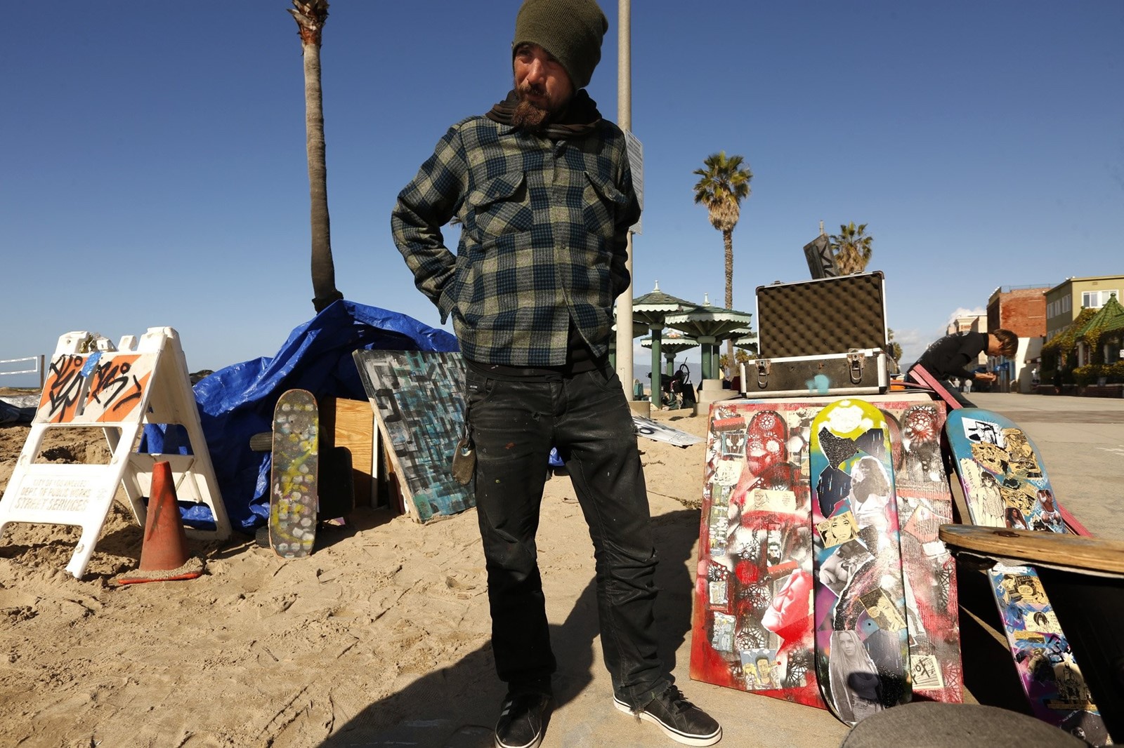 Segovia still lives on the street, selling his artwork on the Venice boardwalk. On Friday, sanitation workers, accompanied by police, threw away some of his artwork and a display table during a bulky-item crackdown, Segovia and other art vendors said. “It was demoralizing,” he said.