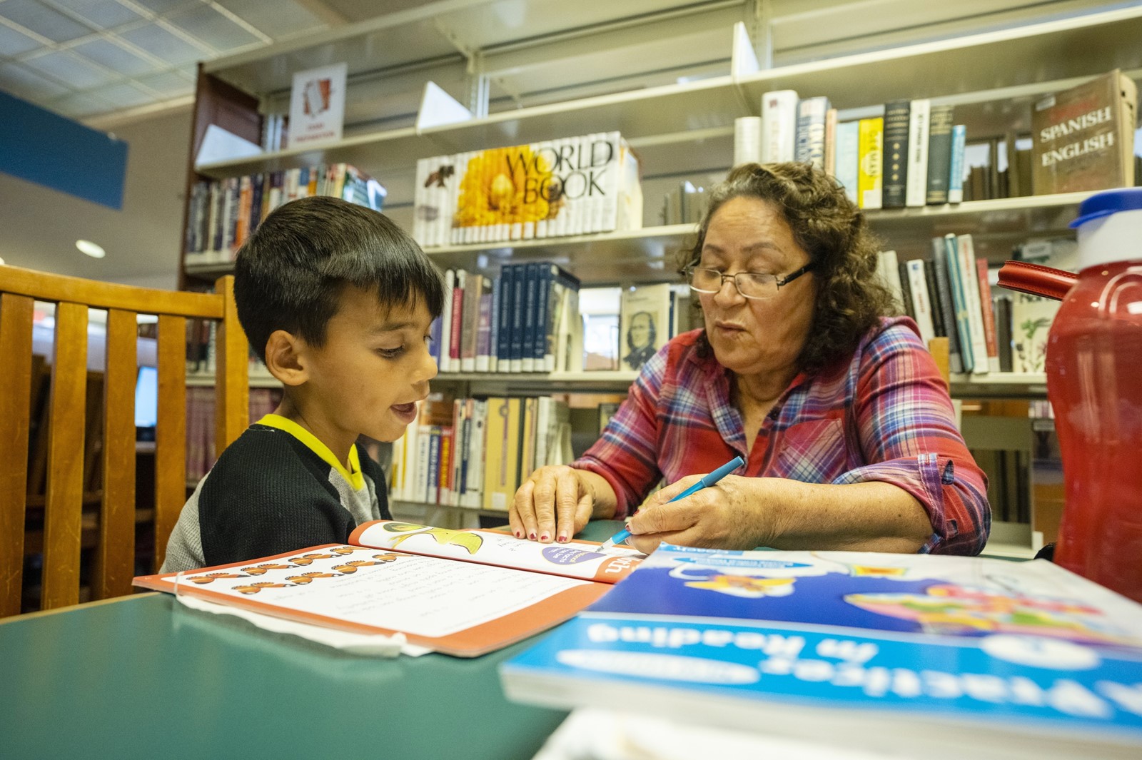 In one quiet corner, Bertha Cuate went through school lessons with 7-year-old Nicolas Maldonado. The retired college professor tutors children at small library branches across southern Kern County.