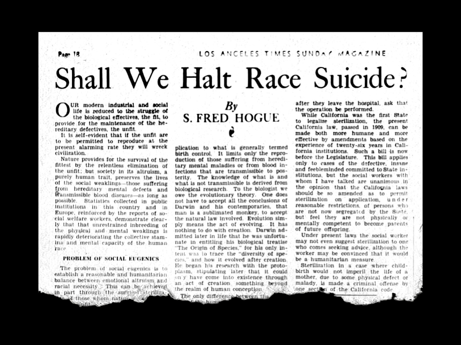 For over six years, from 1935 to 1941, The Times ran a weekly column, “Social Eugenics,” by veteran reporter Fred Hogue. Announced in a lengthy piece entitled “Shall the Unfit Weaken the Race” in the spring of 1935, Hogue laid out a case for eugenic sterilization and the elimination of “defectives” from California and the nation, such as people deemed to be mentally impaired, insane or chronically poor. For Hogue, the title “Social Eugenics” had a particular meaning, encompassing harsh measures such as sterilization and prenuptial certificates to impede the propagation of the “unfit” as well as positive eugenics to ensure that the “fit” were encouraged to breed and thrive. Hogue was fixated on the loosely defined idea of “unfit” humans and of “unwanted babies,” who, due to their supposed “hereditary defectiveness,” menaced the biological makeup of the population and drained the state of precious resources of charity and care. For Hogue, the stakes were high: “To prevent this form of race suicide, it is absolutely essential that the unfit shall not be permitted to continue to reproduce their kind.”