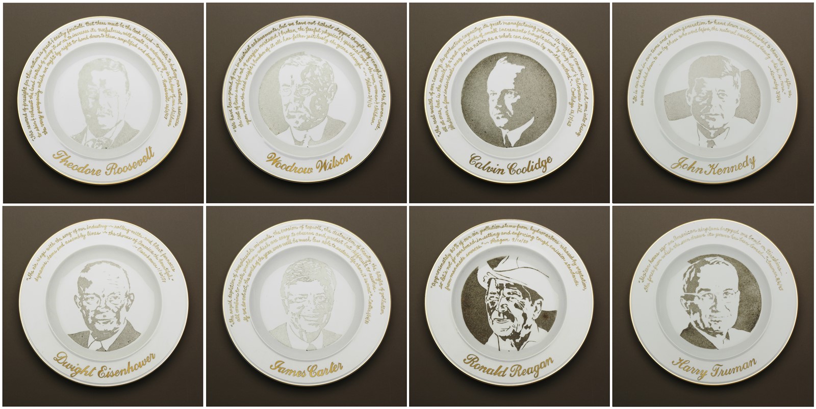 She left out this set of Smog Collectors for a month. Her Presidential Commem- orative Smog Plates, made in 1992, were left out on the roof for a length of time de- termined by each presi- dent’s environmental record.