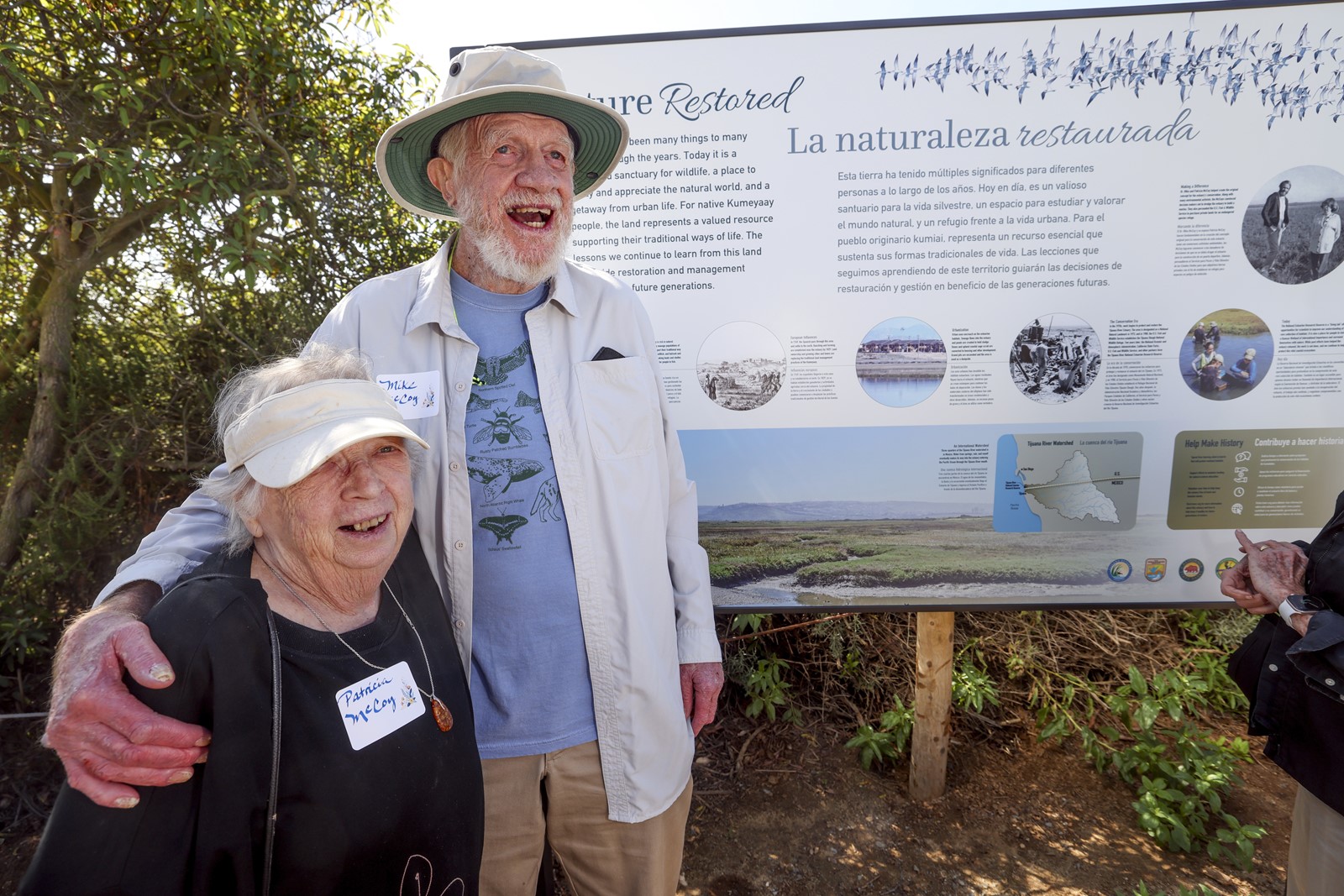 I had the pleasure of walking through the estuary with Mike, past the plaque dedicated to him and his wife and “all who cherish wildlife and the Tijuana Estuary.” We also came upon one of the new interpretive signs that were to be dedicated Friday, including one with a photo of Mike and Patricia as young adults “Making a Difference.”