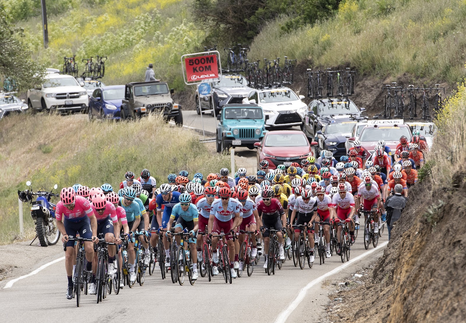 Cycling teams are tailed by team cars working strategy on the fly