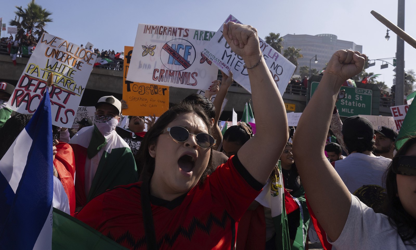 By 1 p.m., the number of protesters ballooned to several thousand, with some carrying signs that said, “MAGA — Mexicans always get across”; “Don’t bite the hand that feeds you,” referring to the state’s agricultural workers; and “I drink my horchata warm because f— I.C.E,” a reference to U.S. Immigration and Customs Enforcement.