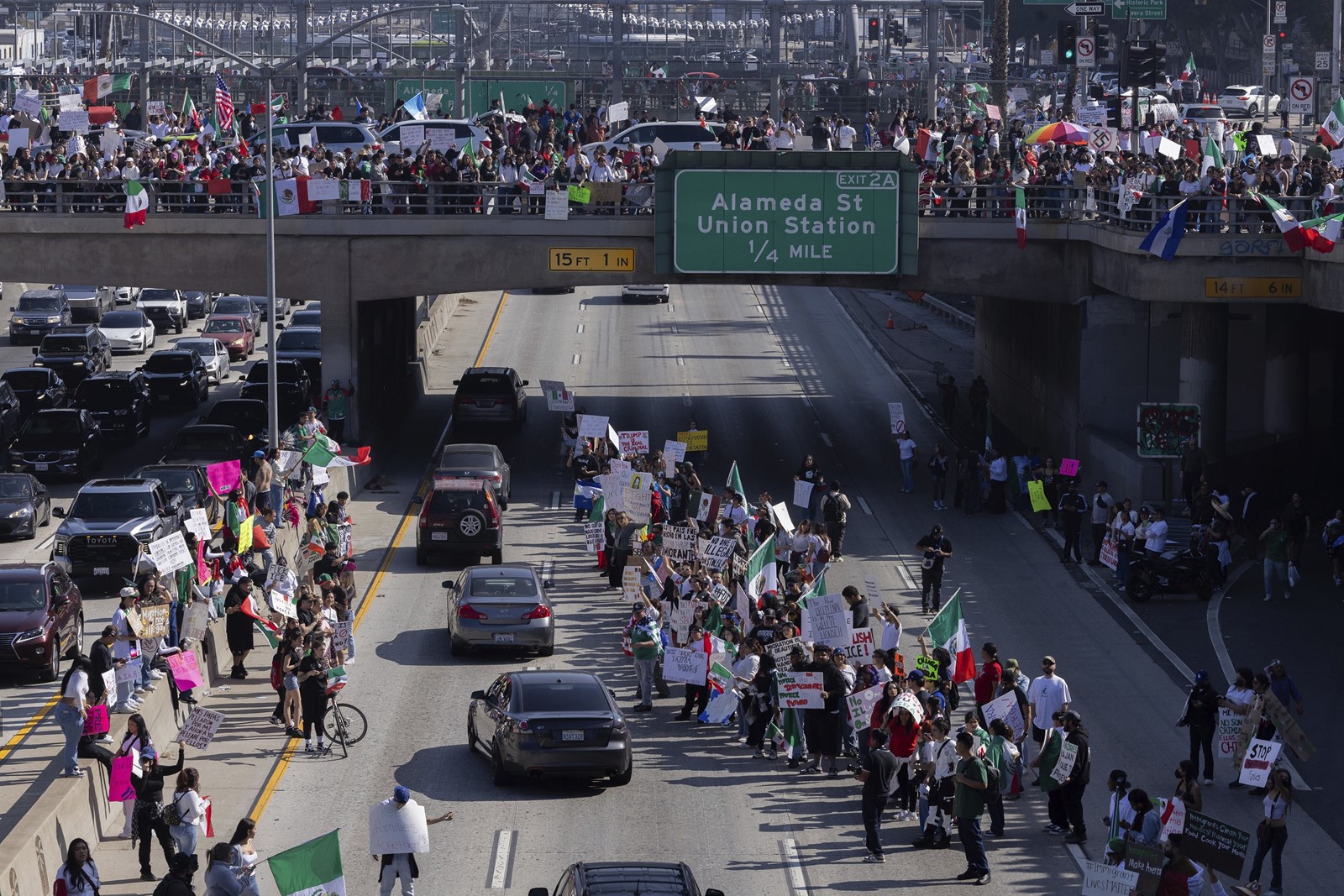 But things appeared to ratchet up when the driver of a silver Mustang began doing doughnuts in a usually busy intersection near City Hall. Soon after, police arrived as dozens of protesters walked onto the nearby 101 Freeway, while hundreds more crowded overpasses, waving flags and holding signs.