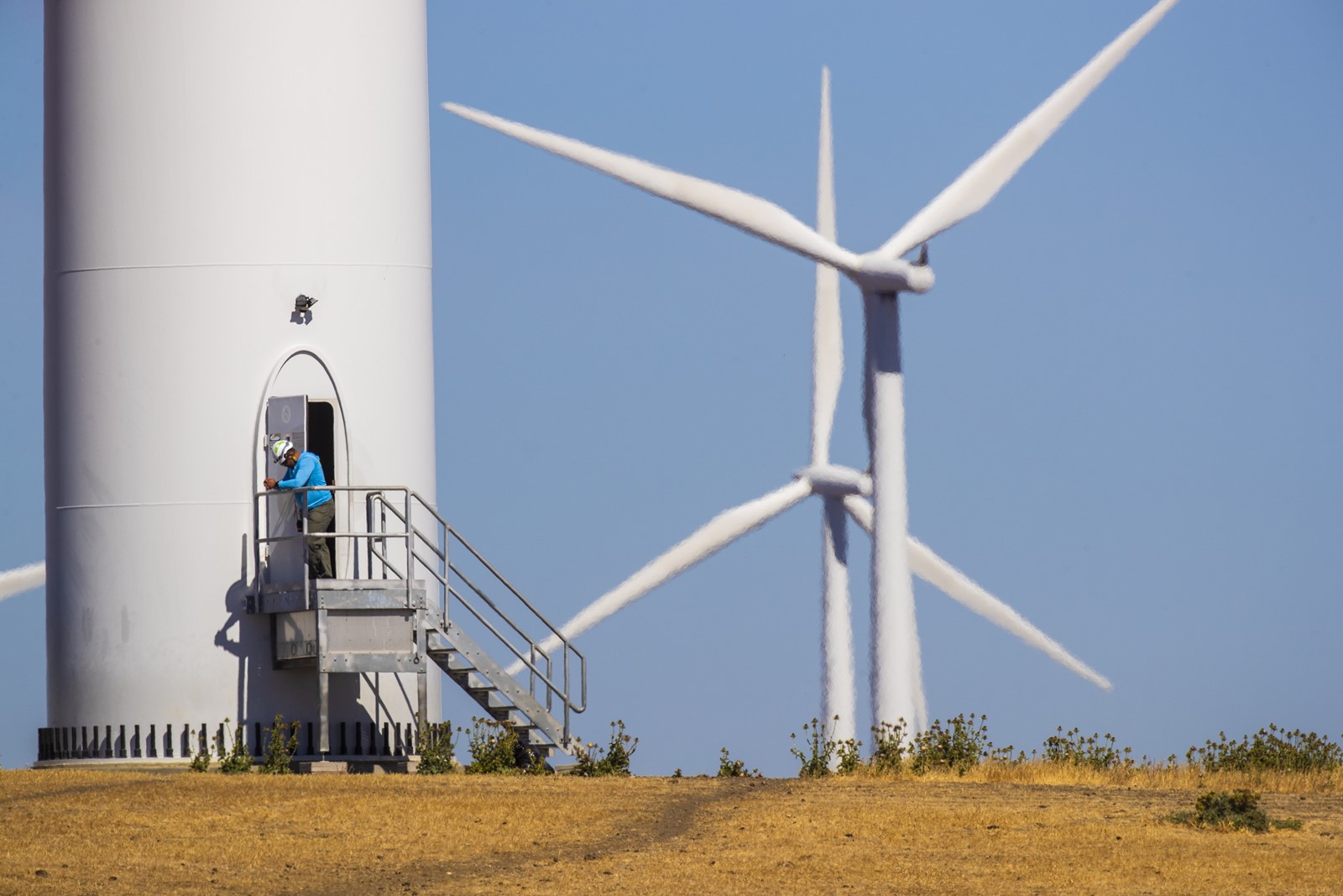 Kelly is a wind turbine technician, and his rock climbing background came in handy as he repaired a fiberglass blade at a wind farm in California’s Montezuma Hills, at the northeastern end of the Bay Area.