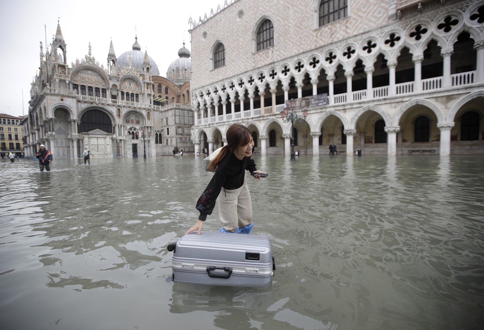 Tourists floated suitcases through St. Mark’s Square, where officials removed walkways to prevent them from floating away. The water was so high that nothing less than thigh-high boots afforded protection. Water poured through wooden boards that shop and hotel owners have placed in front of doors to hold back water during flooding. Tourists staying on the ground floors of hotels were forced to move to upper floors overnight.