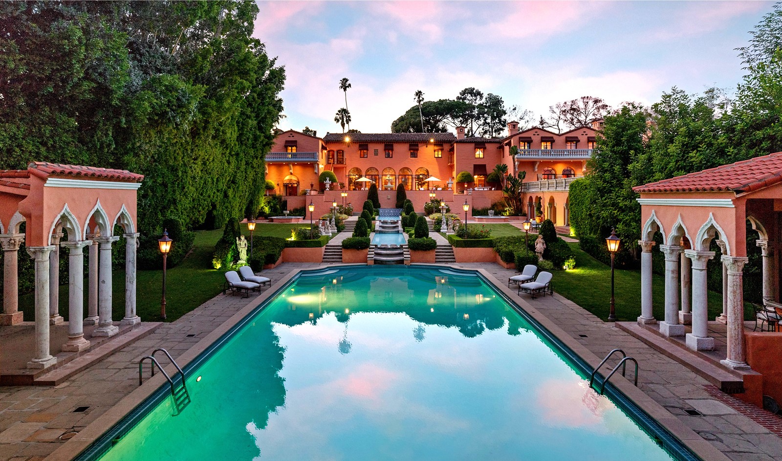 Also known as the Beverly House, the salmon-colored home is shaped like an H and holds eight bedrooms, extending to a variety of patios and balconies. Other structures, including two guesthouses, a pool house and a two-story gatehouse, tack on an additional 7,000 square feet.